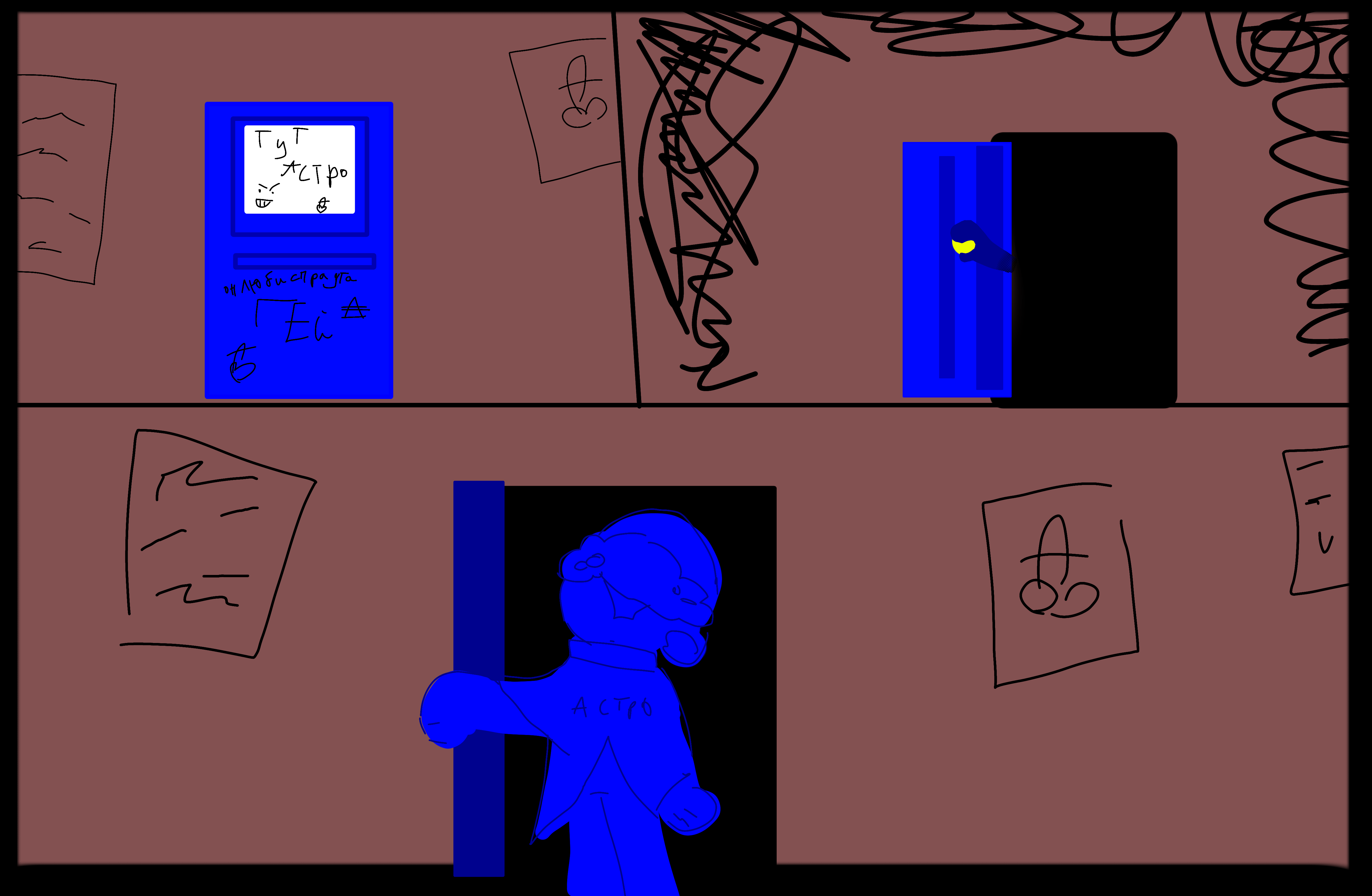 Астро выходит из своей тусклой комнаты.