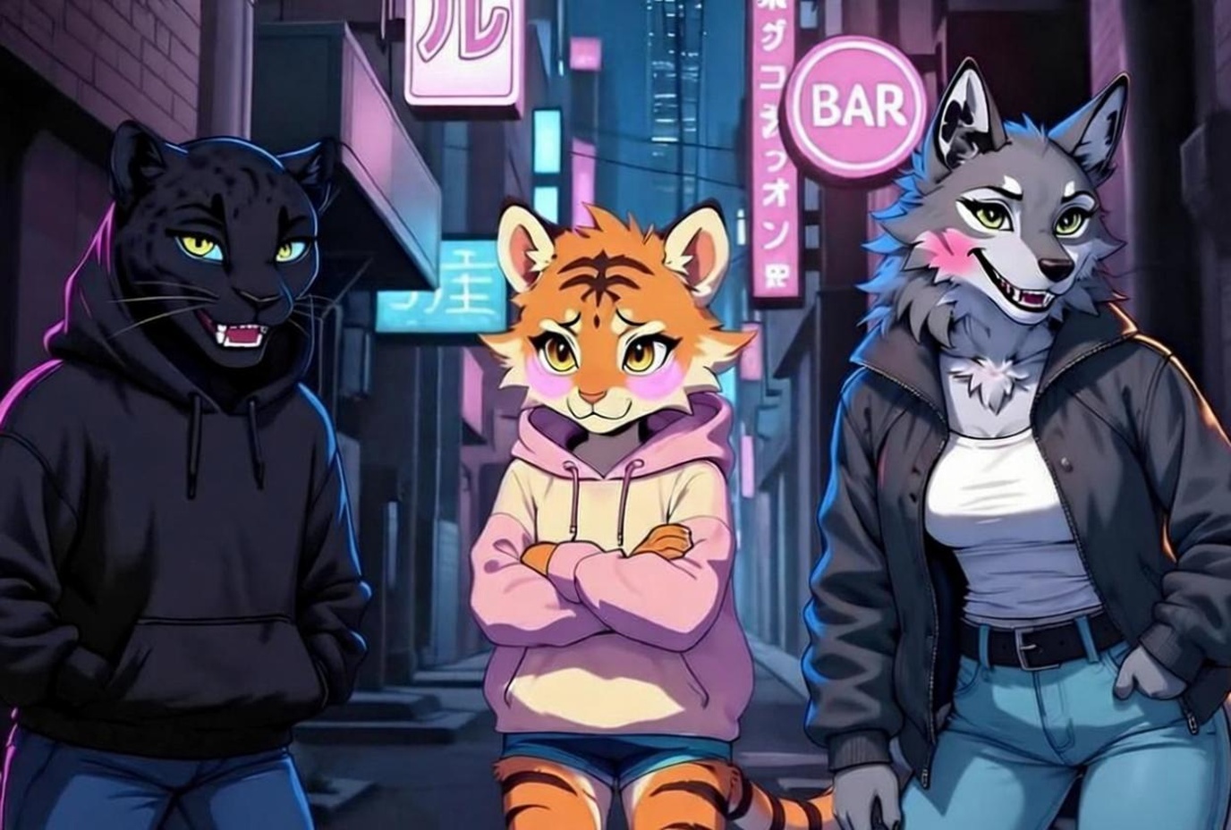 Она поворачивается к Tira и Lira. Tira краснеет ещё сильнее, ушки прижаты, хвост нервно дёргается. Lira делает шаг ближе, зелёные глаза вспыхивают интересом и тихой надеждой.