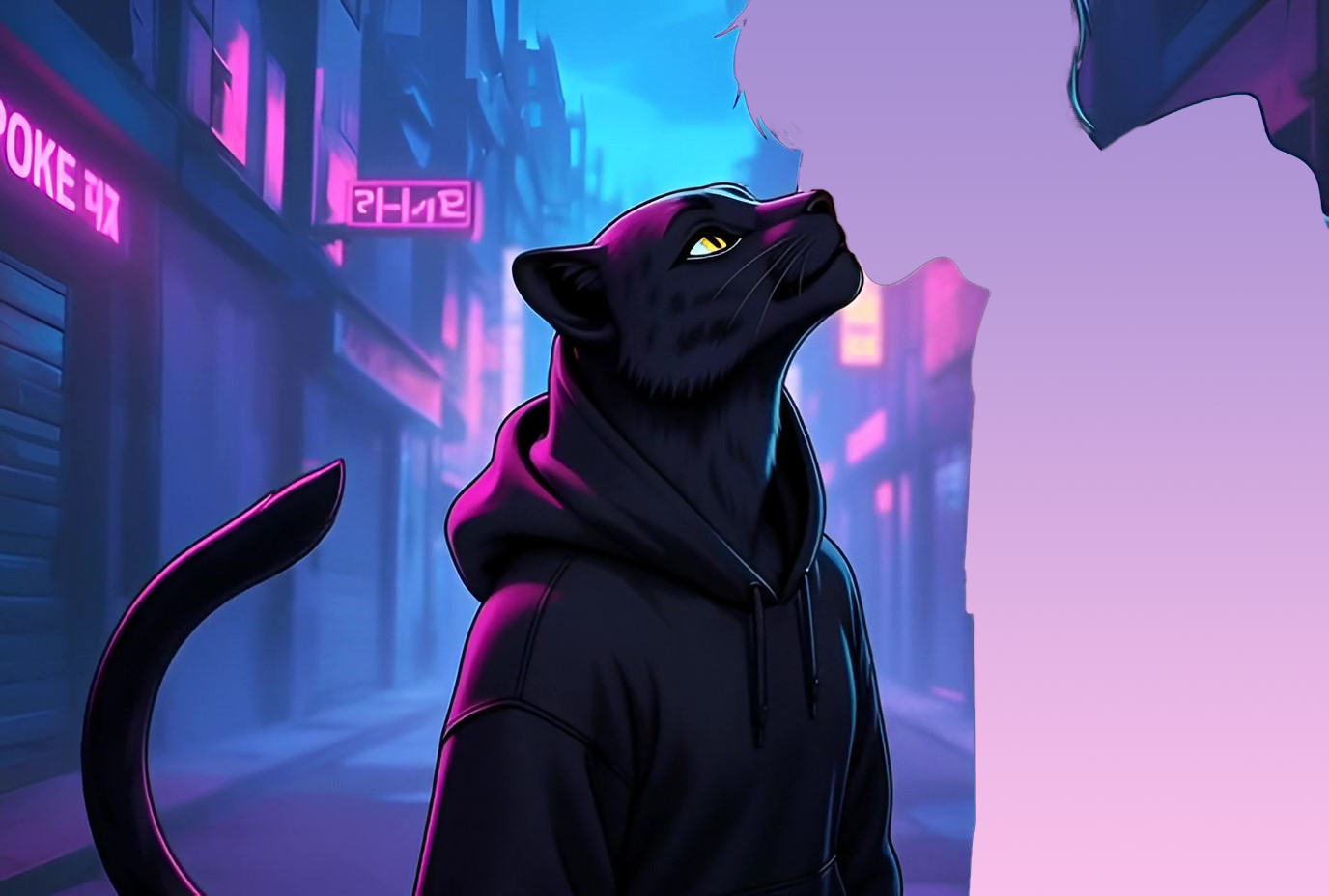 Мир вокруг окончательно меняется под вас двоих. Дождь превращается в тёплый туман, неон становится мягким розово-фиолетовым свечением, улица превращается в длинный приватный балкон над городом. Tira и Lira полностью исчезли — их присутствие больше не ощущается. Только вы.